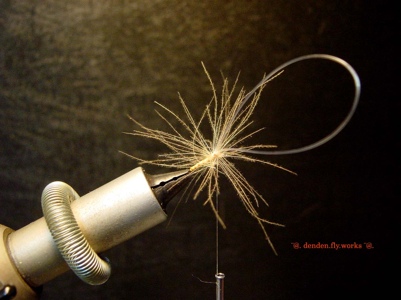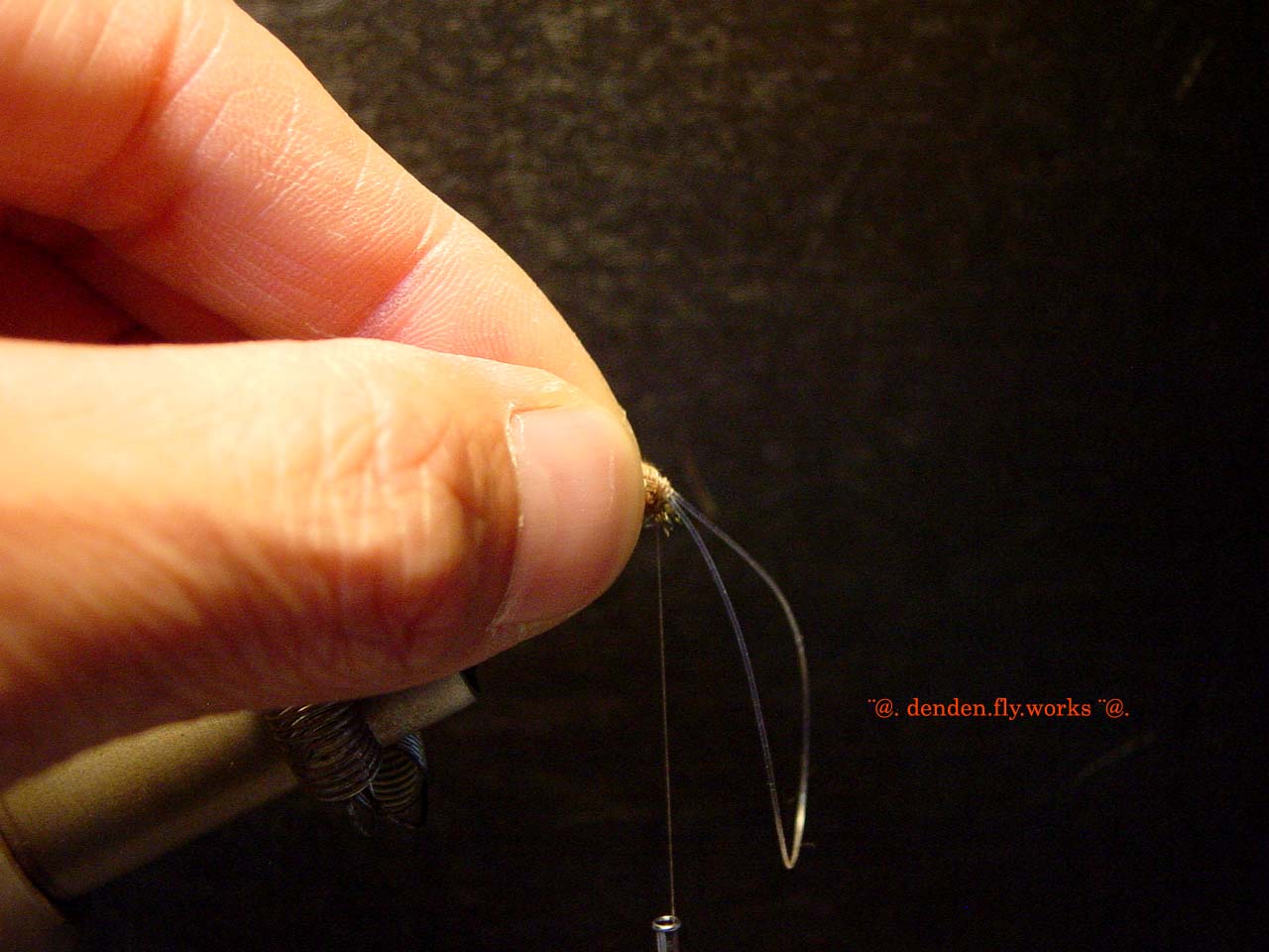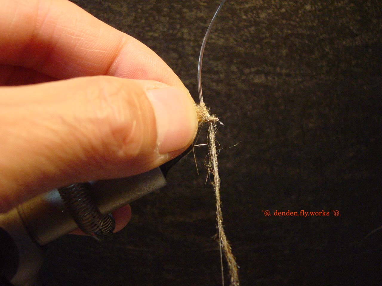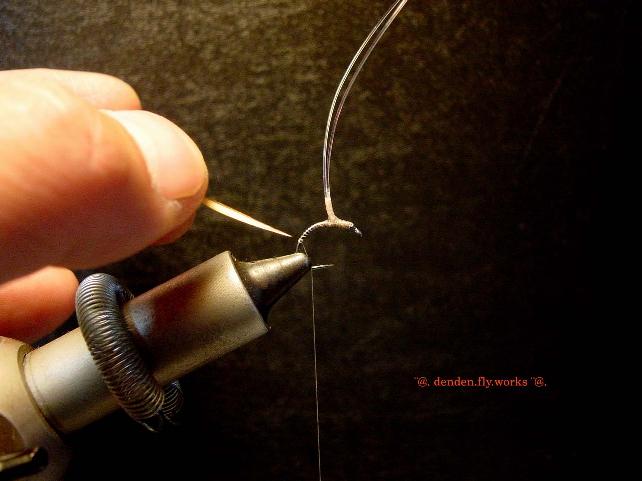 ⑥ バイオットをハックルプライヤーで挟みボディを作ります。
