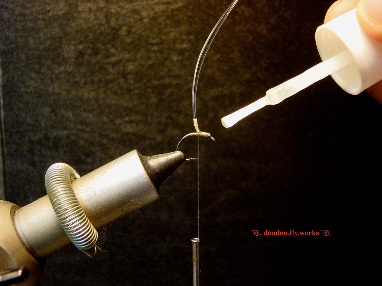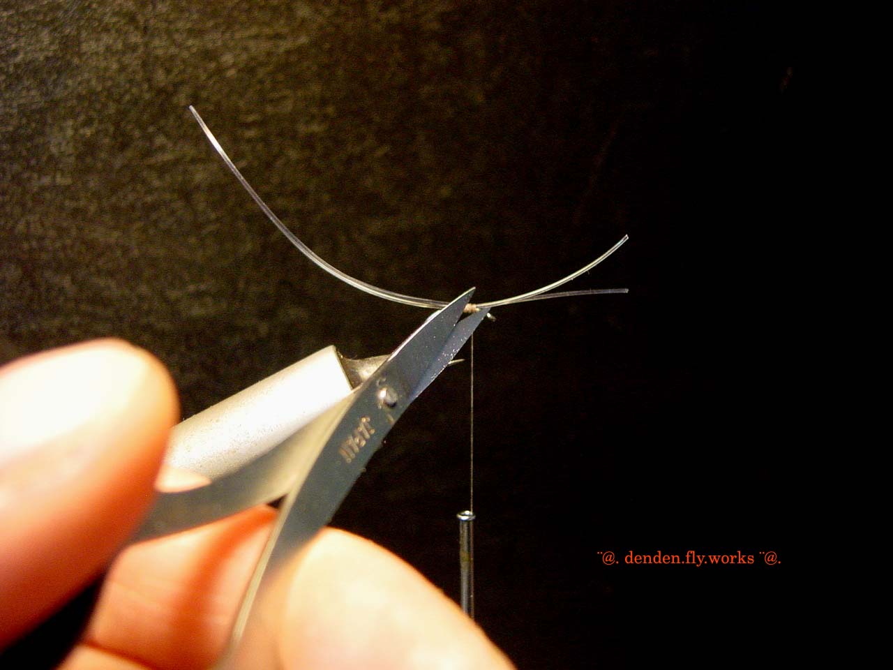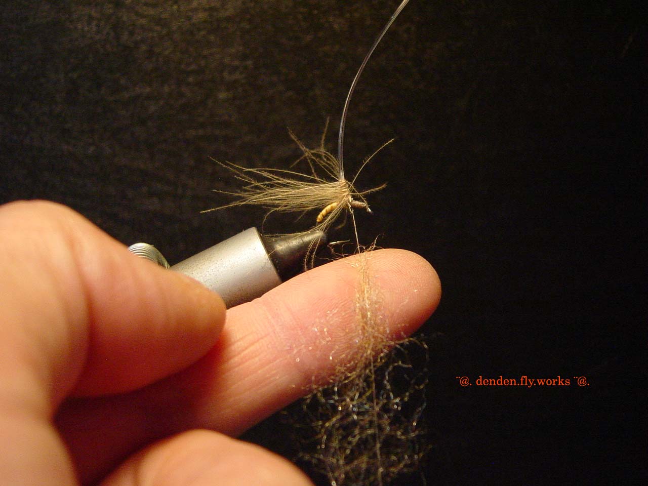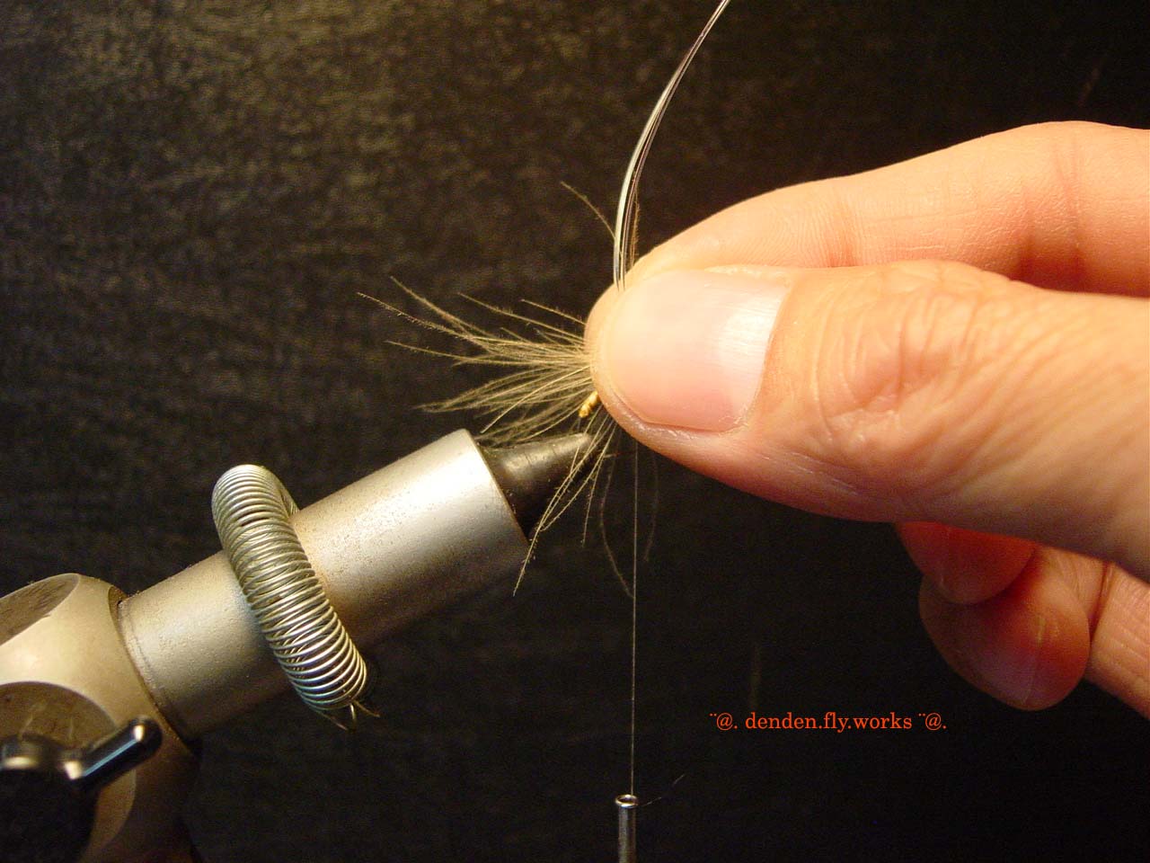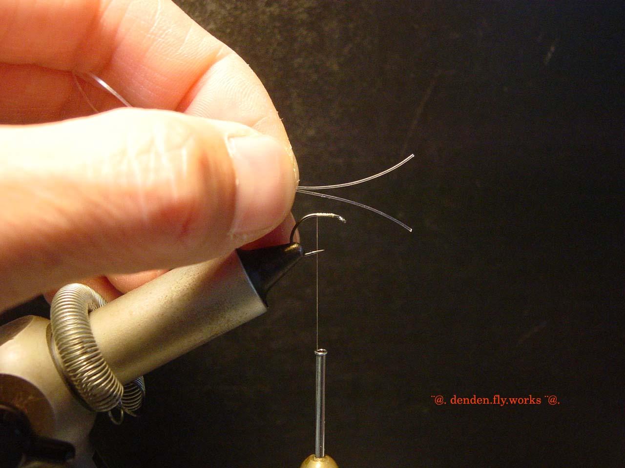 ⑥ バイオットをハックルプライヤーで挟みボディを作ります。