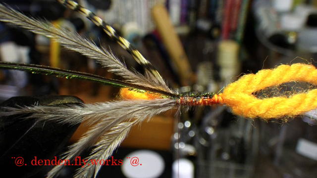 ③グレーのオーストリッチ数本とピーコックハールを縛る。