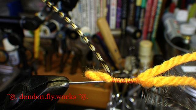 ⑨ 最初と同じ手順で寄りつけたオーストリッチ&ピーコックハールを巻く。